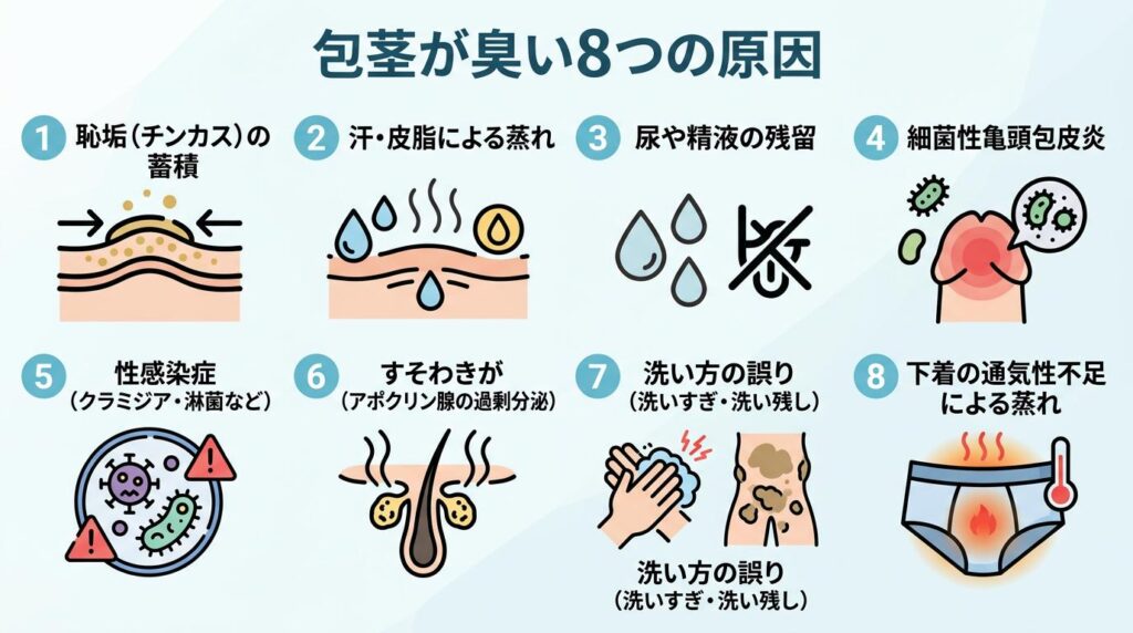 包茎の臭いは、恥垢の蓄積・蒸れ・細菌性疾患・性感染症など複数の原因が重なって生じることがほとんどです。