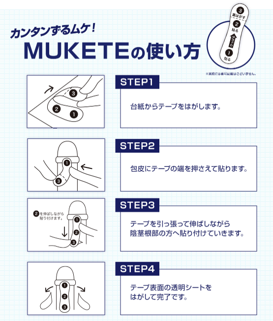 MUKETEは、包皮を手で剥いた状態でテープを貼り、その状態を一日中キープすることで包皮に剥きぐせをつけることを目的とした商品です。